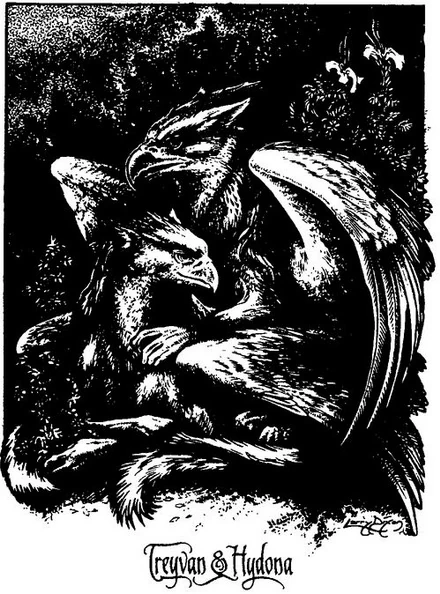 Hydona is a female gryphon from White Gryphon. Her name, Hydona, means "kindness."[1] She and her mate, Treyvan, were sent to explore the world outside White Gryphon, and stayed for years in a set of ruins over a node near k'Leshya Vale. She and Treyvan took Darkwind as a foster-son, and call him "Featherless Son".